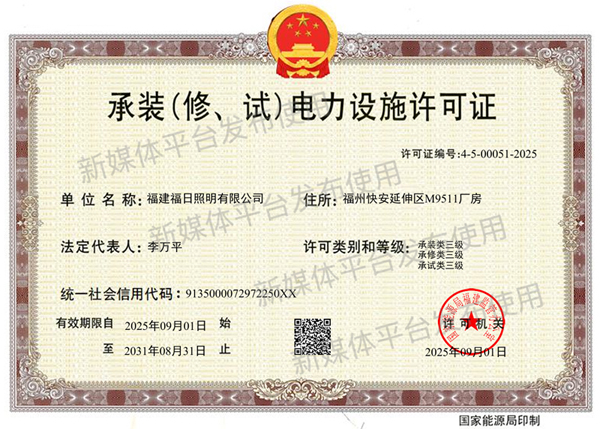 近日,福日電子成員企業(yè)福日照明順利通過國家能源局福建監(jiān)管辦公室核準,成功取得承裝(修、試)電力設施許可證(三級)資質(zhì)。這標志著福日照明已具備承接35kV及以下電壓等級電力設施的安裝、維修和試驗業(yè)務的全面能力,為企業(yè)進一步拓展電力工程市場提供了堅實保障。